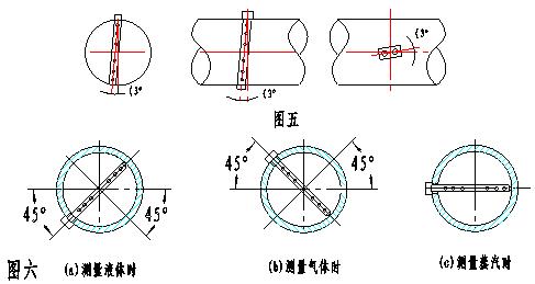 3、 對(duì)于垂直管道,檢測(cè)桿可安裝在管道水平面沿管道圓周360°的任何位置上,高低壓引壓管接頭應(yīng)處于同一水平面上。對(duì)于水平管道,在測(cè)量液體時(shí)檢測(cè)桿插入位置應(yīng)位于管道橫截面水平面中心線45°以下的范圍內(nèi);測(cè)量氣體時(shí)檢測(cè)桿插入位置應(yīng)位于管道橫截面水平面中心線45°以上的范圍內(nèi);測(cè)量蒸汽時(shí)檢測(cè)桿應(yīng)水平插入,見圖六: