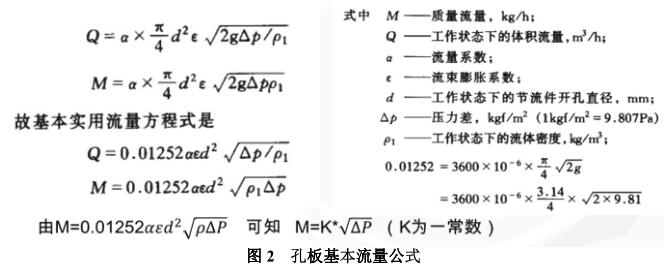 根據流體力學中的伯努利方程和流體連續性方程式可推導標 準孔板的流量與壓差之間定量關系的基本流量公式,如圖 2 所示。
