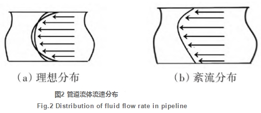 (2)在圓形管道中流體充分發展后,管道中間的流速比較均勻,但是管壁處流速梯度較大。圖2(a)為理想流速分布,當雷諾數較小時弧度較大,對應流速差別也大。但由于現場管道安裝復雜(例如有大量彎管、閥門等),實際流速分布如圖2(b)所示。若流速越低,則不同位置流速差異越速同時伴隨著素流或渦流產生,所以在實際應用中管道內平均流速很難準確測得。
