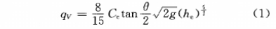 式中:qv--體積流量,m³/s;Ce--流量系數(shù)(需查表);θ--角缺口夾角,20°≤θ≤100°;he--有效水頭,m,he=h+Kh(h-實(shí)測(cè)水頭,m,Kh--水頭修正系數(shù))。