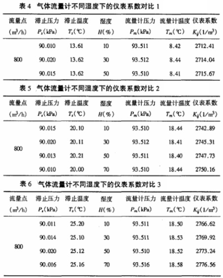由表4~表6可以看出,被檢流量計在相同滯止壓力、相同滯止溫度不同環境濕度下檢定得出的儀表系數是不同的,總體趨勢是儀表系數隨著濕度的增大而增大。其中,滯止溫度為13.60℃時,50%濕度與10%濕度下的儀表系數相差近0.12%;滯止溫度為20.00℃時,不同濕度下的儀表系數最大相差近0.27%;滯止溫度為25.00℃時,不同濕度下的儀表系數最大相差近0.36%。由此可見,隨著滯止溫度的升高,環境濕度對儀表系數的影響越來越大。因此,在流量計檢定過程中,盡可能保持檢定間濕度的穩定,以便保證檢定數據的科學準確性。