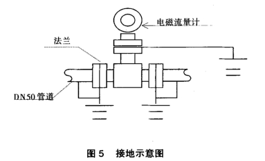 電磁流量計是基于導電性流體在磁場中運動所產生的感應電動勢來推算流體流量的測量儀表,其基本工作原理是電磁感應定律。因此電磁耦合、靜電感應是電磁流量計干擾噪聲的首要來源,在管線上存在雜.散電壓干擾。為了保證液體與地同電位,避免液體與.地有電位差以及因空間電磁干擾而造成的測量誤差,所以,對接地做了嚴格的要求。本裝置與管道為固定法蘭連接,固定法蘭和管道以及流量傳感器均用2.5mm2的銅芯線作了良好的接地見圖5。