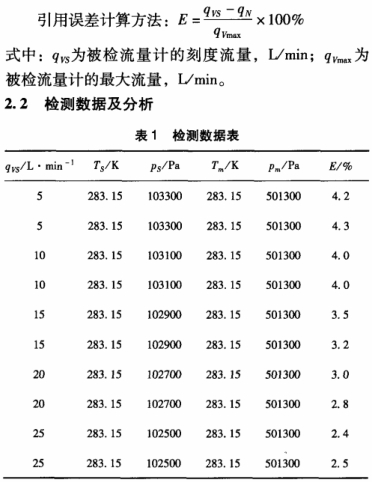 選用標準氣表,對高金屬管浮子流量計進行在線實流檢測。當標準氣表和被檢測流量計的流量達到穩定時,讀取標準氣表和被檢測流量計的指示流量,記錄標準氣表和被檢測流量計進口處的壓力、溫度,計算被檢測流量計的實際流量。工作介質經過在線高壓被檢浮子流量計后,氣體壓力大幅度降低,進人標準氣表的氣體壓力已是常壓,所以被檢高壓浮子流量計和標準氣表都可正常工作。