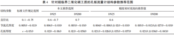 通過對孔板流量計各結構參數的模擬研究,明確了在進行超臨界二氧化碳工質質量流量測量時,孔板流量系數隨各結構參數的變化趨勢與相對誤差,本節主要對以上模擬結果進行總結分析,參考《用能單位能源計量器具配備和管理通則》中的準確度規定,,給出了針對超臨界二氧化碳工質的孔板流量計結構參數推薦設計范圍,在該范圍內經驗計算公式的計算結果可滿足2.5準確度等級要求,還進一步提出了該范圍內精度相對更高的結構參數推薦值,將以上結果與現行國際標準ISO5167-2:2003中標準孔板流量計各結構參數的規定范圍進行對比,如表4所示。